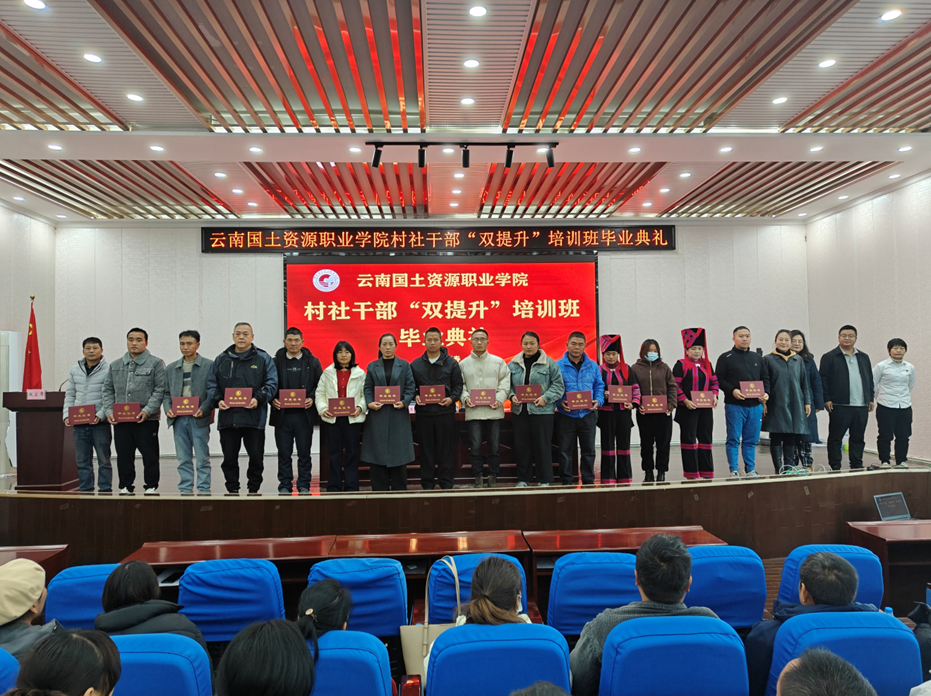 2026年1月8日,云南国土资源职业学院与绿春县联合举办的村社干部“双提升”成人学历函授班毕业典礼在绿春县委党校隆重举行。绿春县委组织部副部长李普成,我校副校长张云霞、继续教育与培训学院院长钱敏及教师代表出席典礼,45名学员顺利毕业,标志着为期三年的校地合作人才培养项目取得圆满成功。